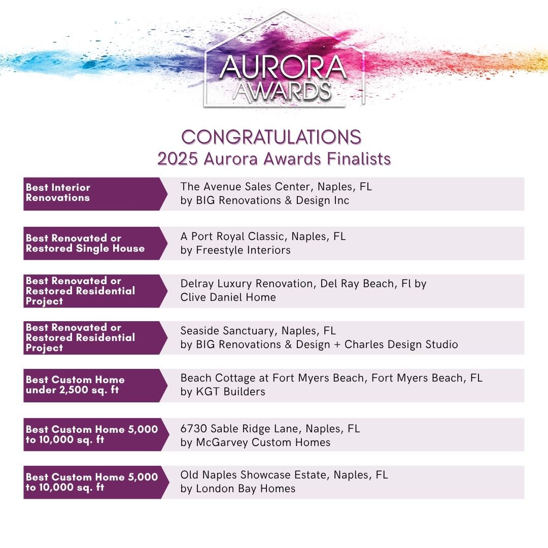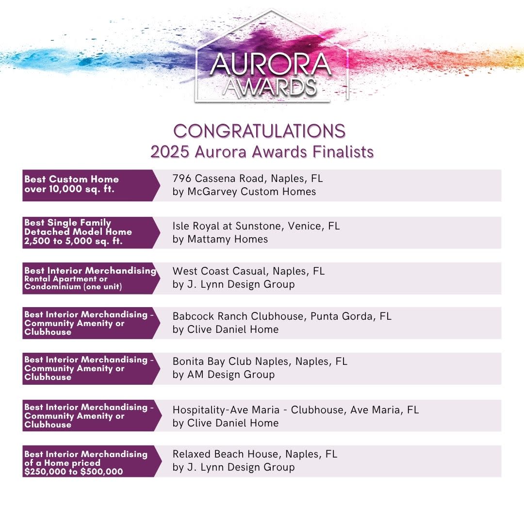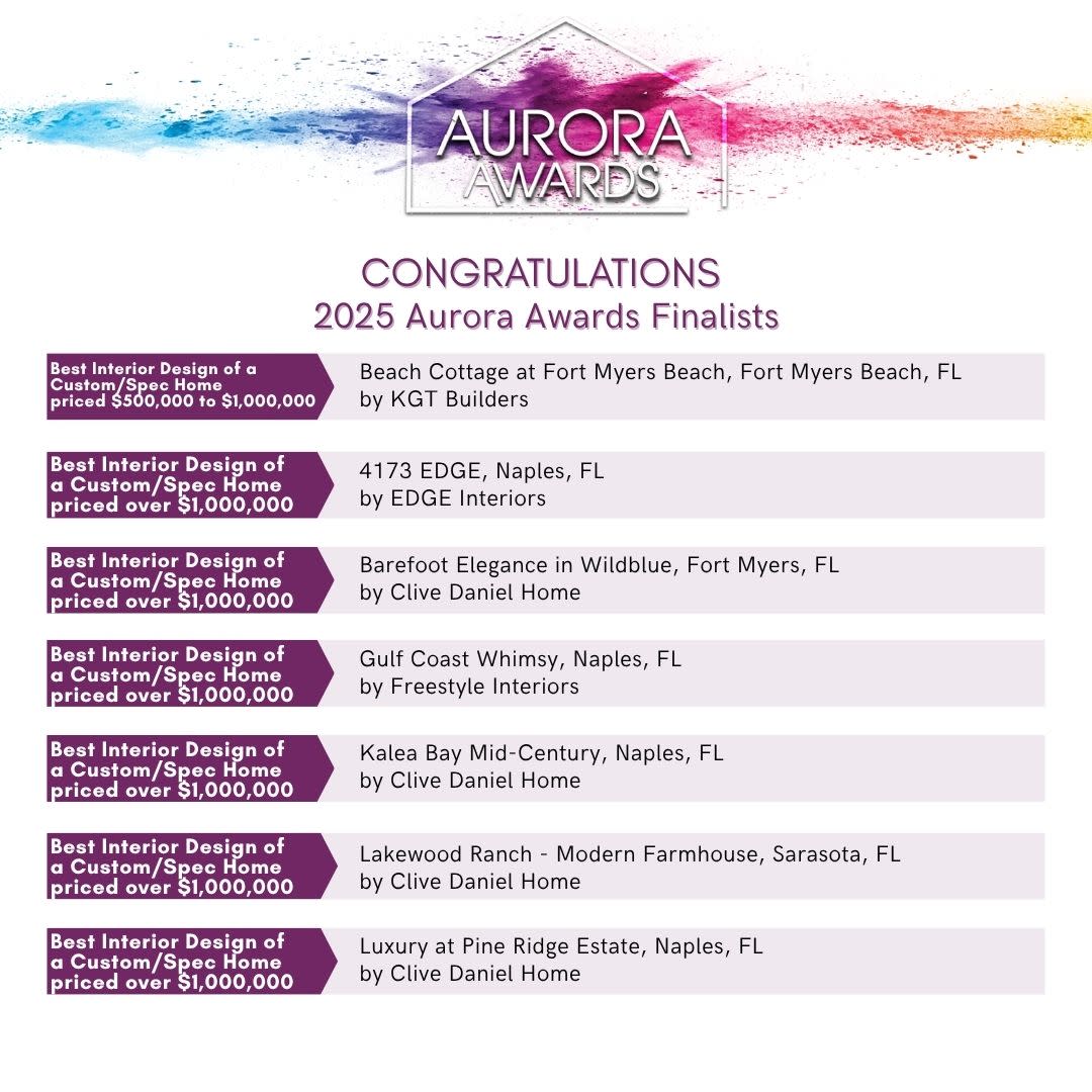 Join the Florida Home Builders Association at the Gaylord Palms Resort and Convention Center, Saturday, July 26, for the 2025 Aurora Gala as we reveal the Grand Winners and the 2025 Golden Aurora, as selected from the following 2025 Aurora Award Finalists! Congratulations to all!