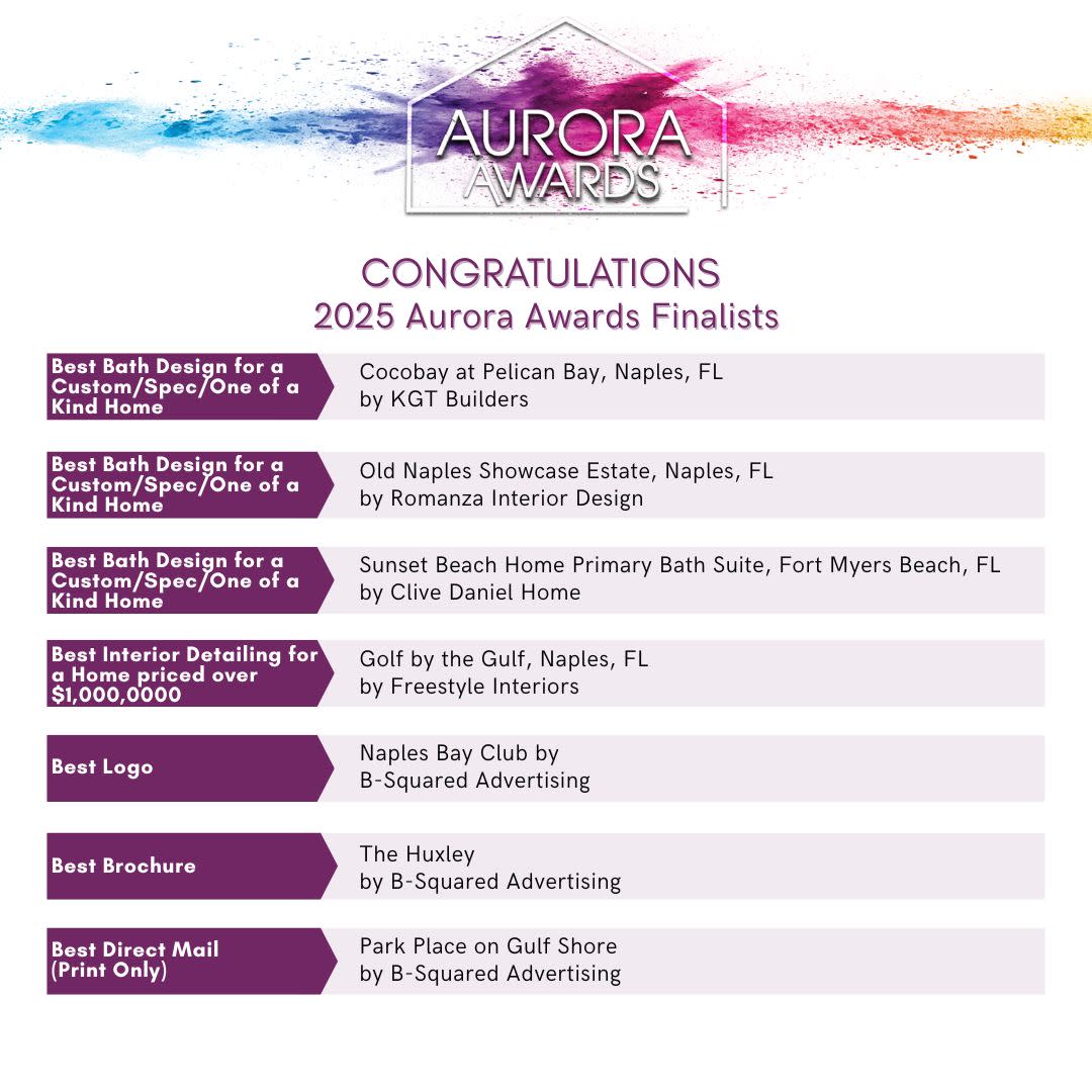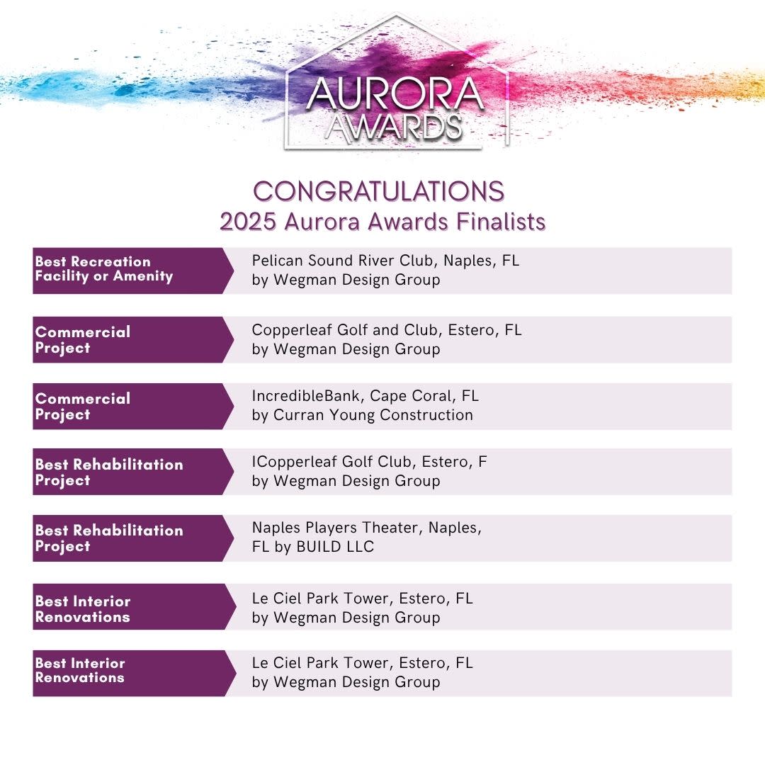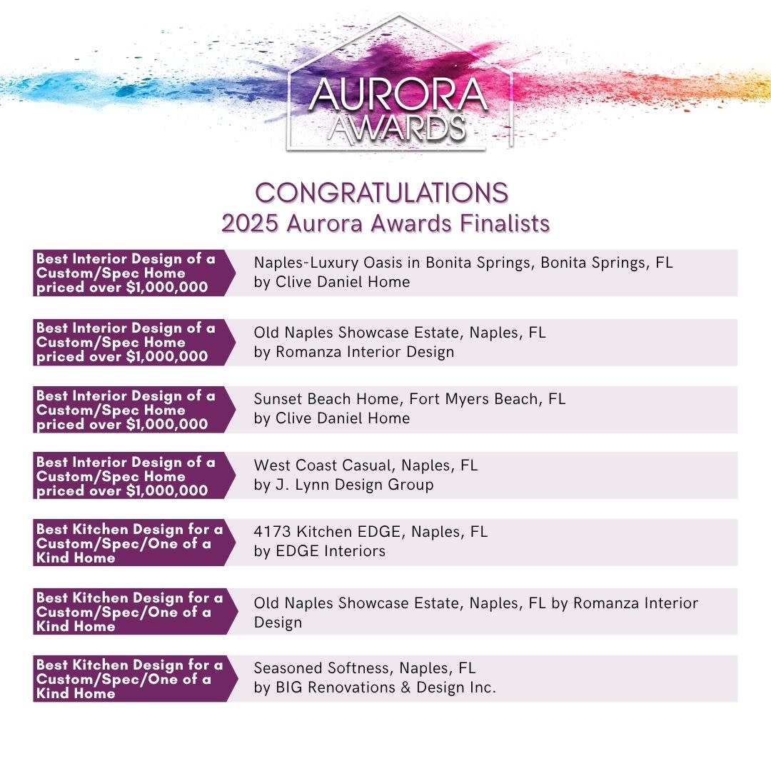 Join the Florida Home Builders Association at the Gaylord Palms Resort and Convention Center, Saturday, July 26, for the 2025 Aurora Gala as we reveal the Grand Winners and the 2025 Golden Aurora, as selected from the following 2025 Aurora Award Finalists! Congratulations to all!